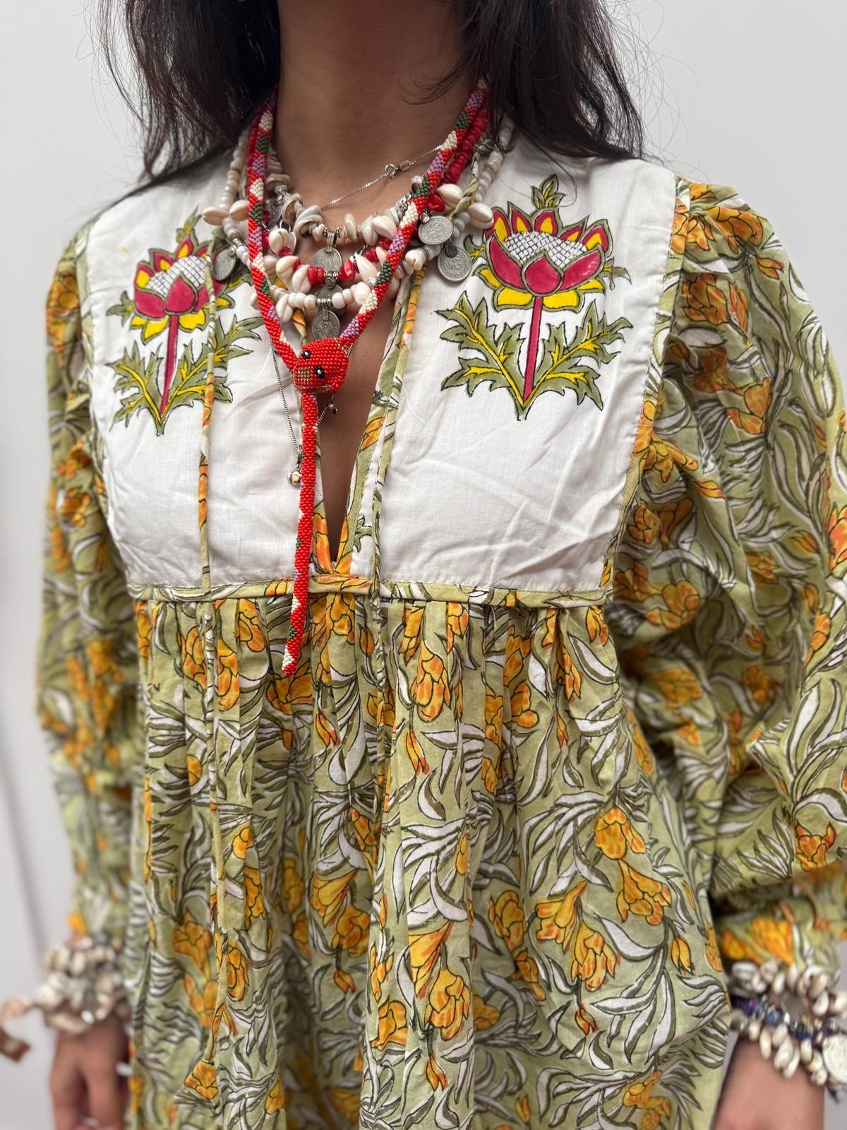 Blokprint jurken uit India zijn een prachtige weerspiegeling van een eeuwenoude ambachtelijke traditie die diep geworteld is in de Indiase cultuur. Deze jurken worden gekenmerkt door hun unieke, handgemaakte patronen die met behulp van houten blokken op de stof worden gedrukt.