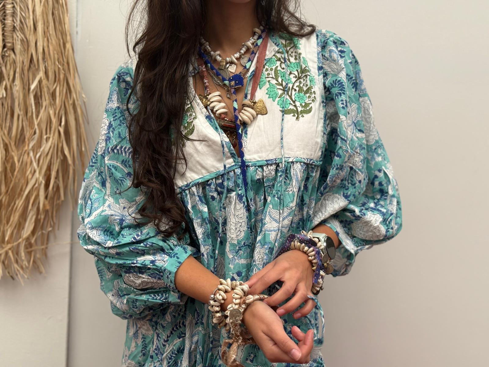 Blokprint jurken uit India zijn een prachtige weerspiegeling van een eeuwenoude ambachtelijke traditie die diep geworteld is in de Indiase cultuur. Deze jurken worden gekenmerkt door hun unieke, handgemaakte patronen die met behulp van houten blokken op de stof worden gedrukt.