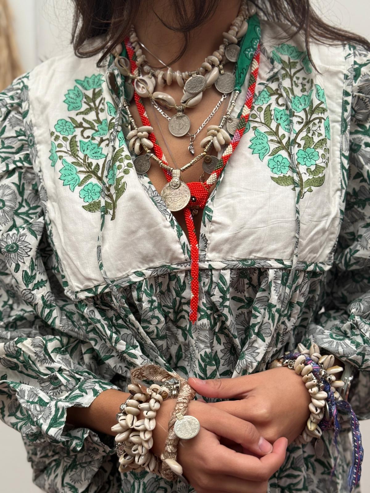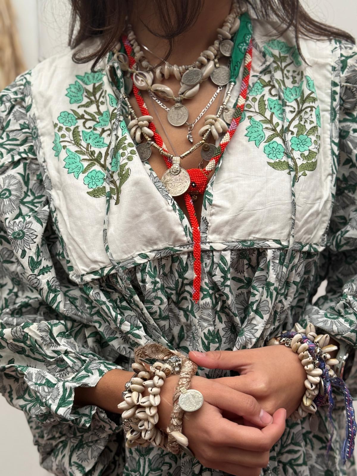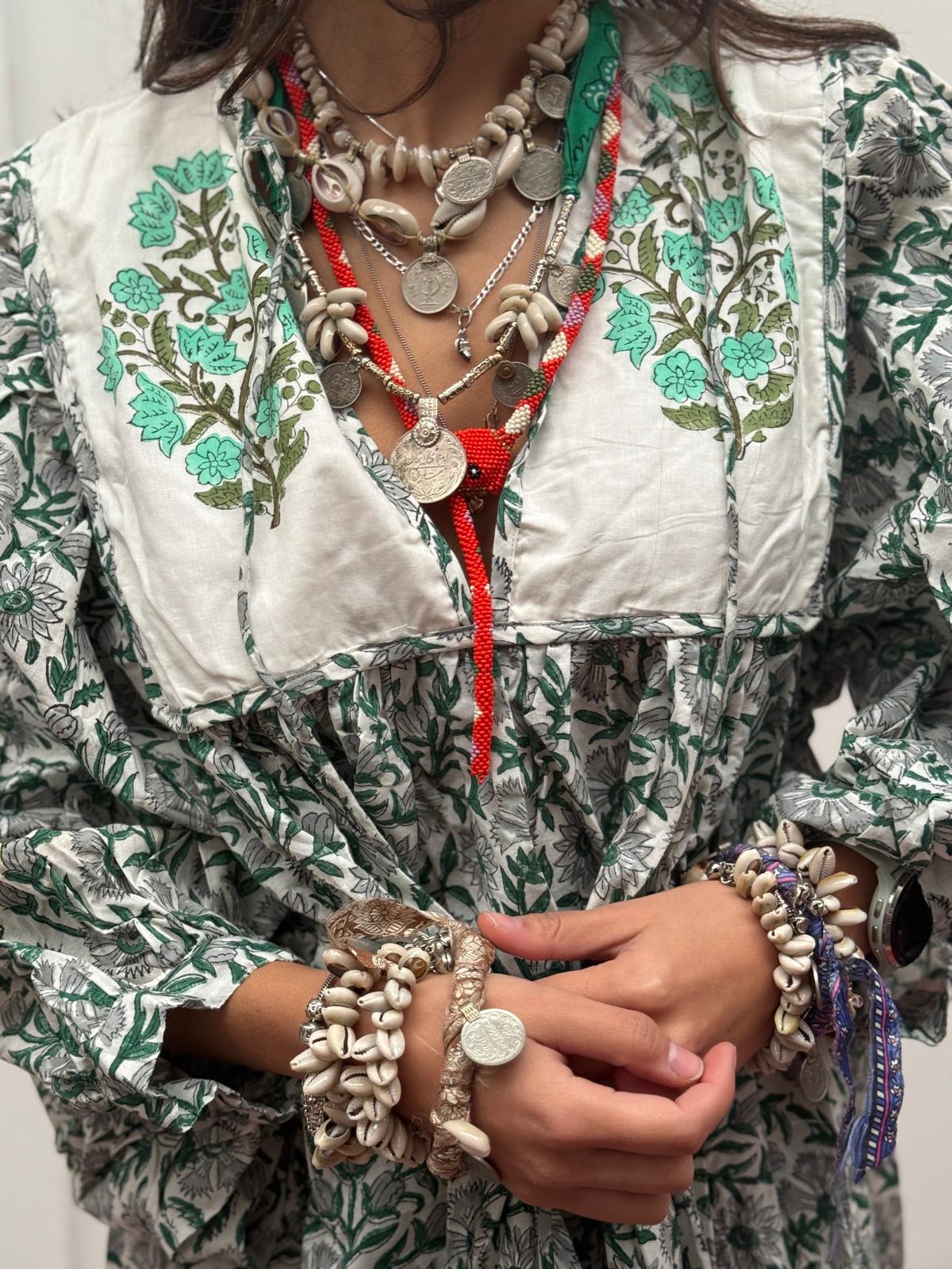 Blokprint jurken uit India zijn een prachtige weerspiegeling van een eeuwenoude ambachtelijke traditie die diep geworteld is in de Indiase cultuur. Deze jurken worden gekenmerkt door hun unieke, handgemaakte patronen die met behulp van houten blokken op de stof worden gedrukt.