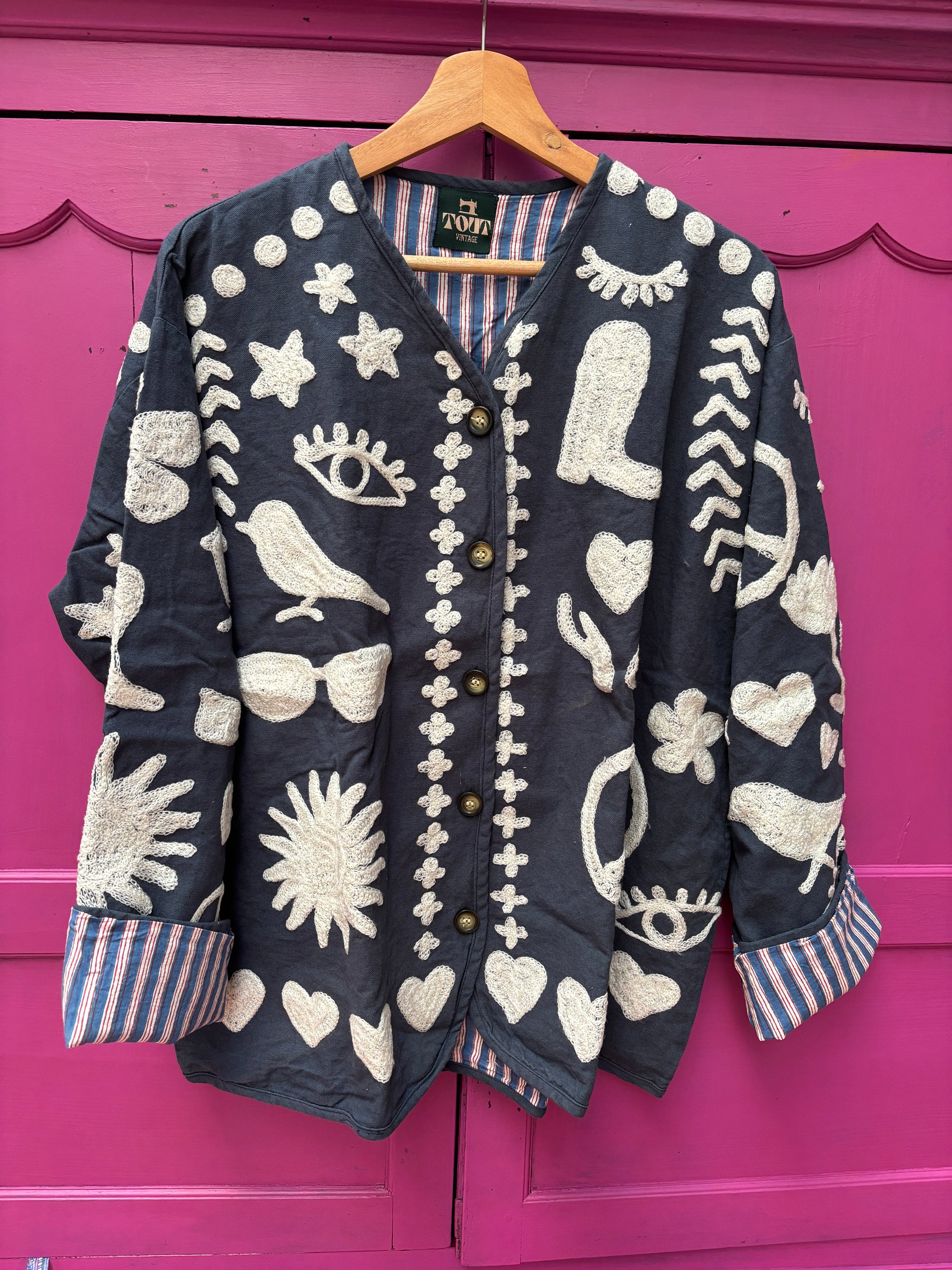 Dit jacket is gemaakt van velvet stof en geborduurd met de mooiste garen. Alles is zorgvuldig geselecteerd met respect voor mens en planeet.