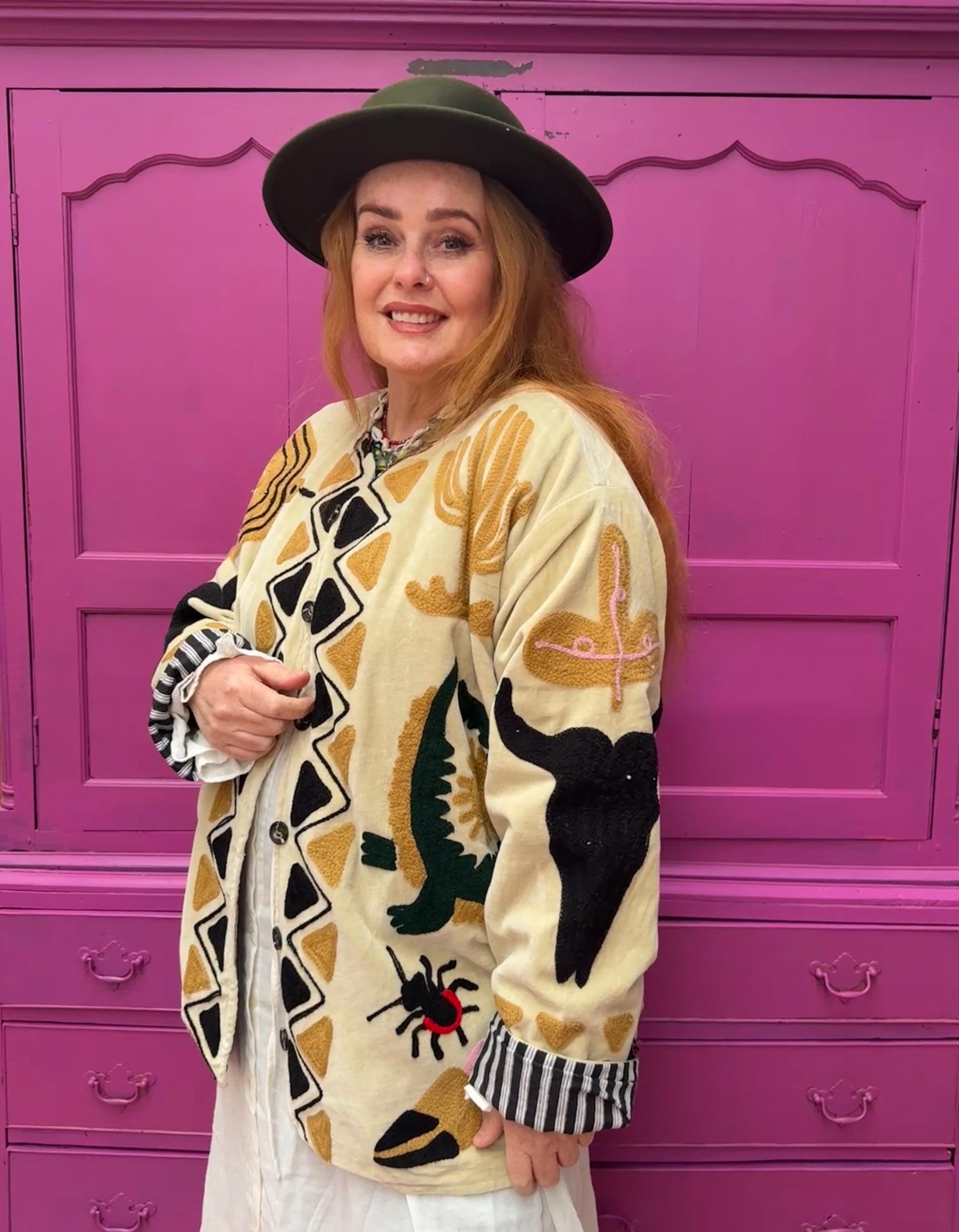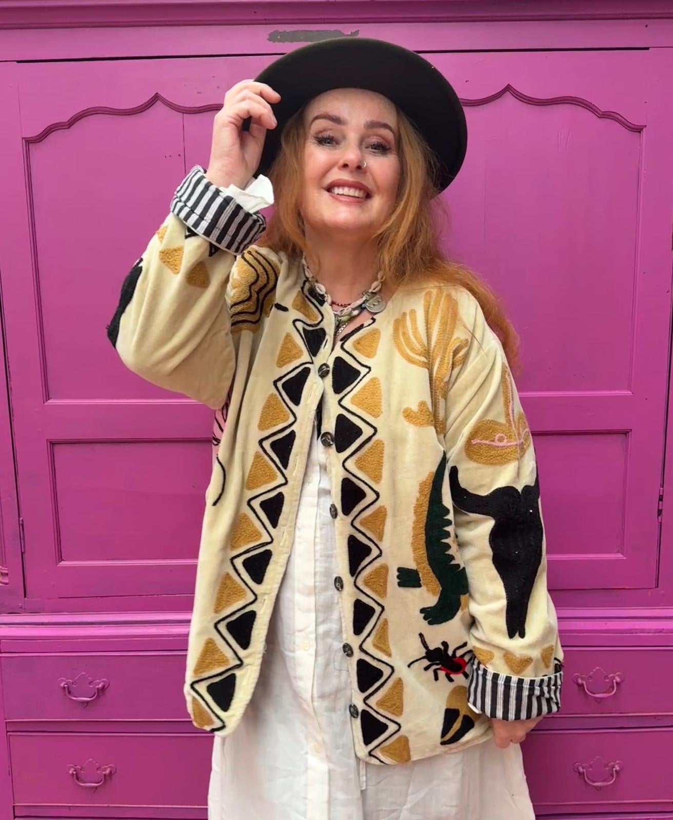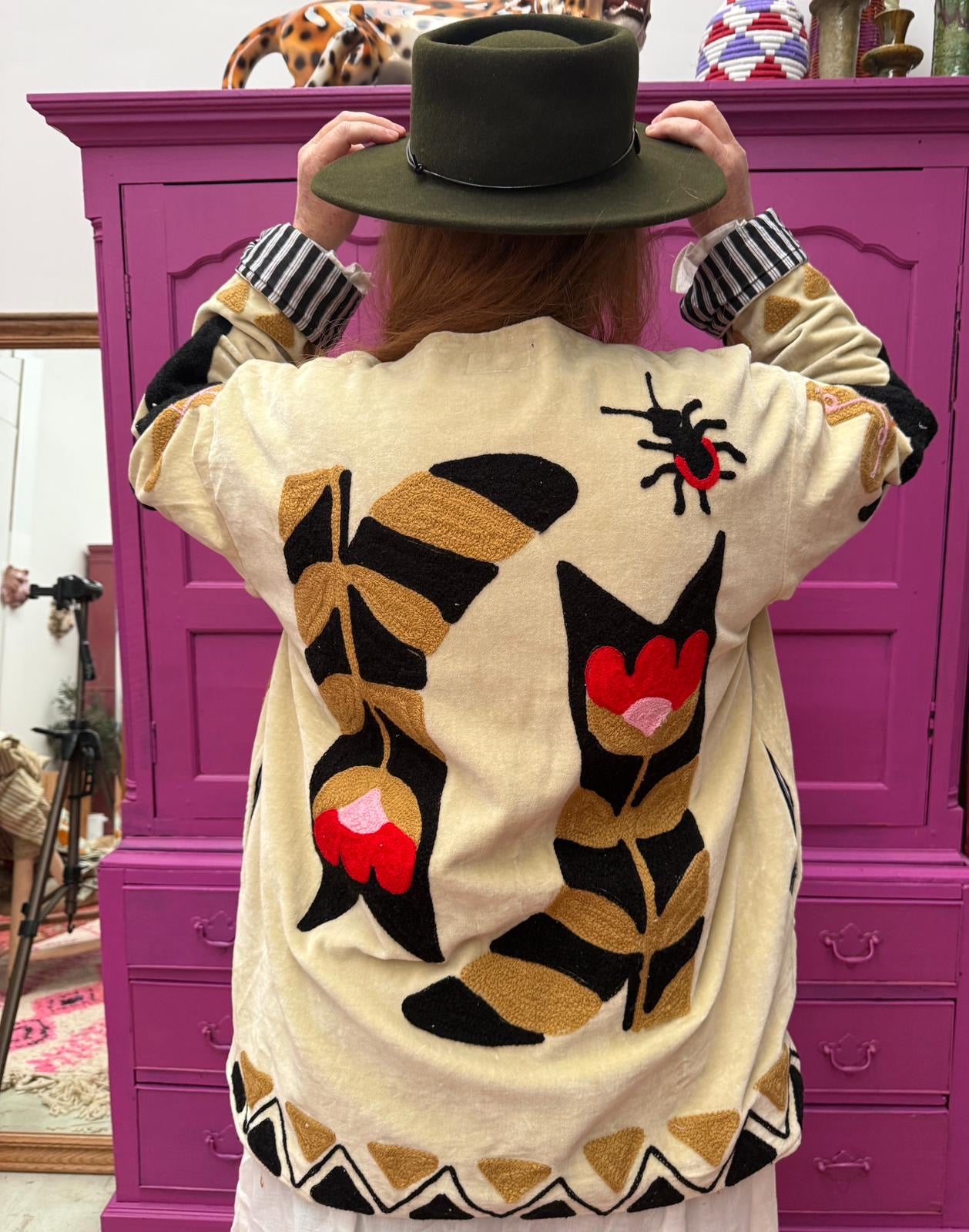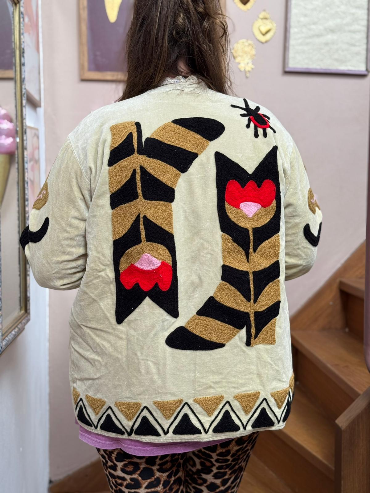Dit jacket is gemaakt van velvet stof en geborduurd met de mooiste garen. Alles is zorgvuldig geselecteerd met respect voor mens en planeet.