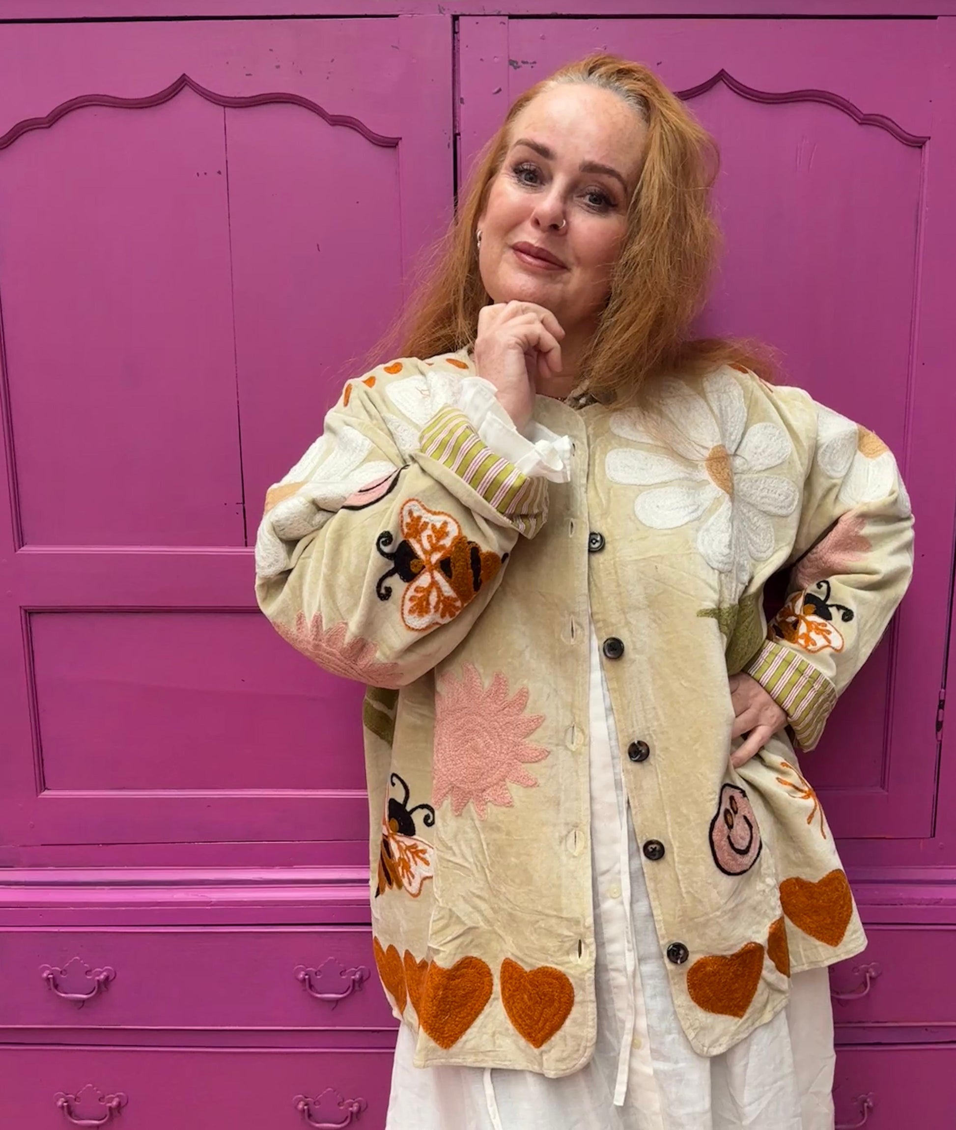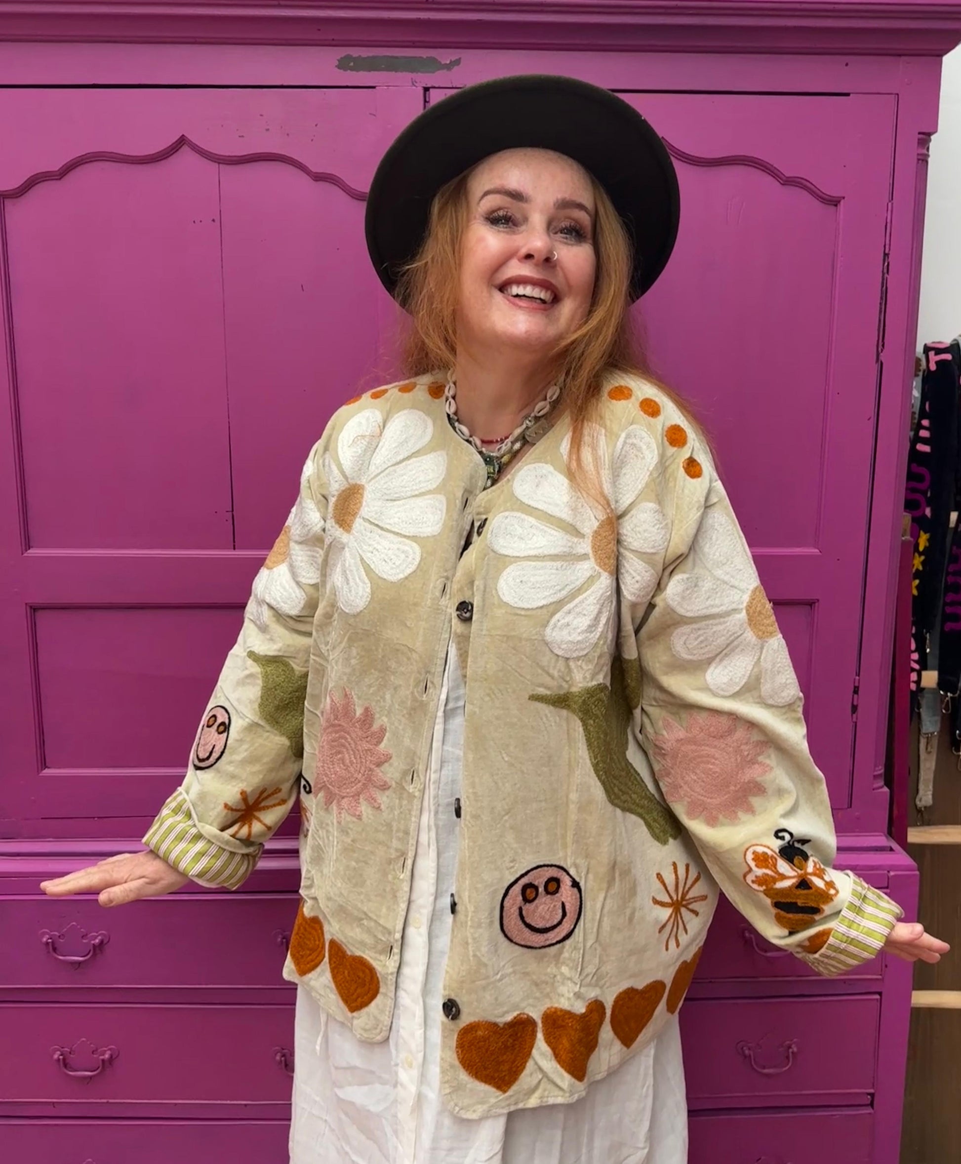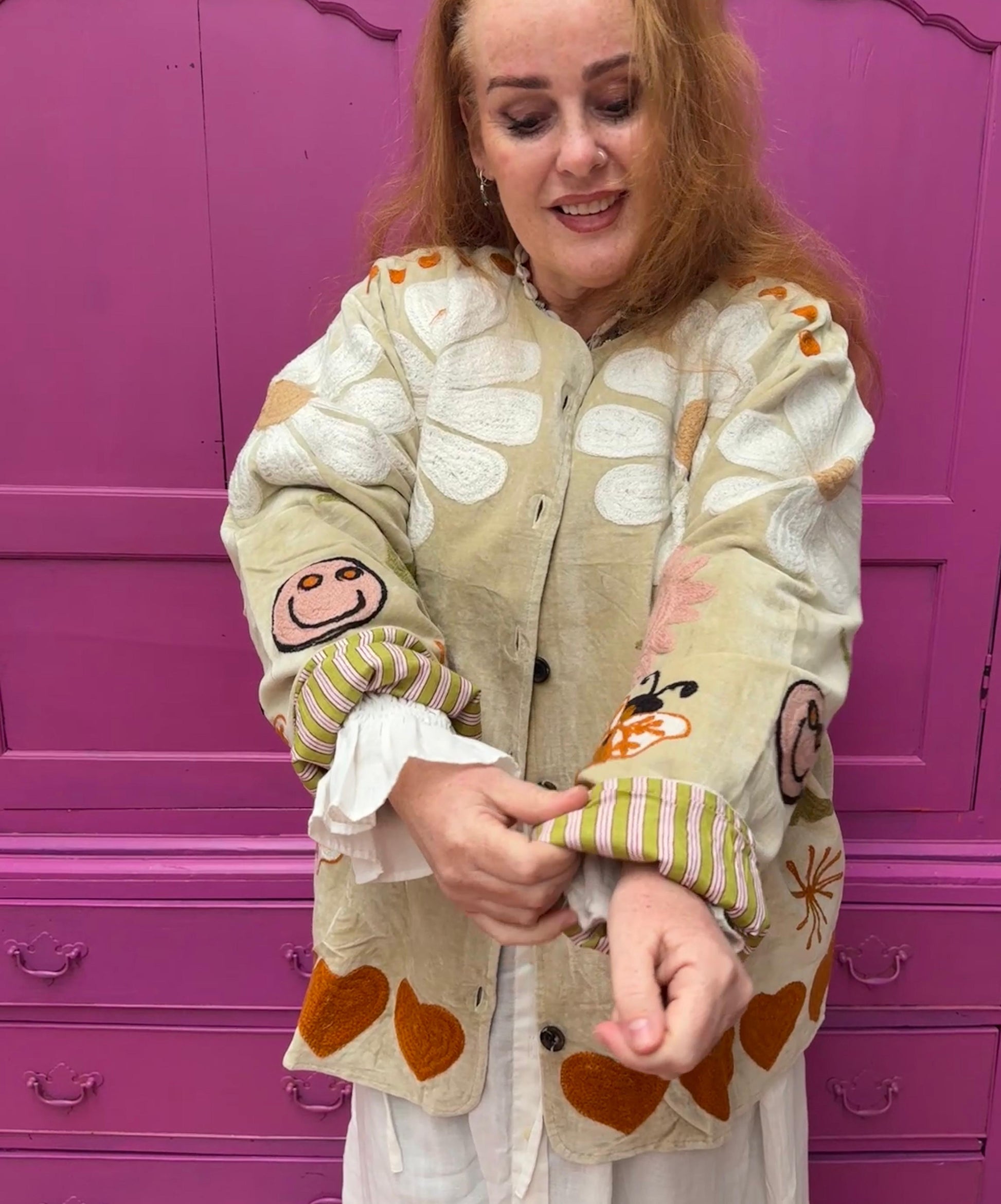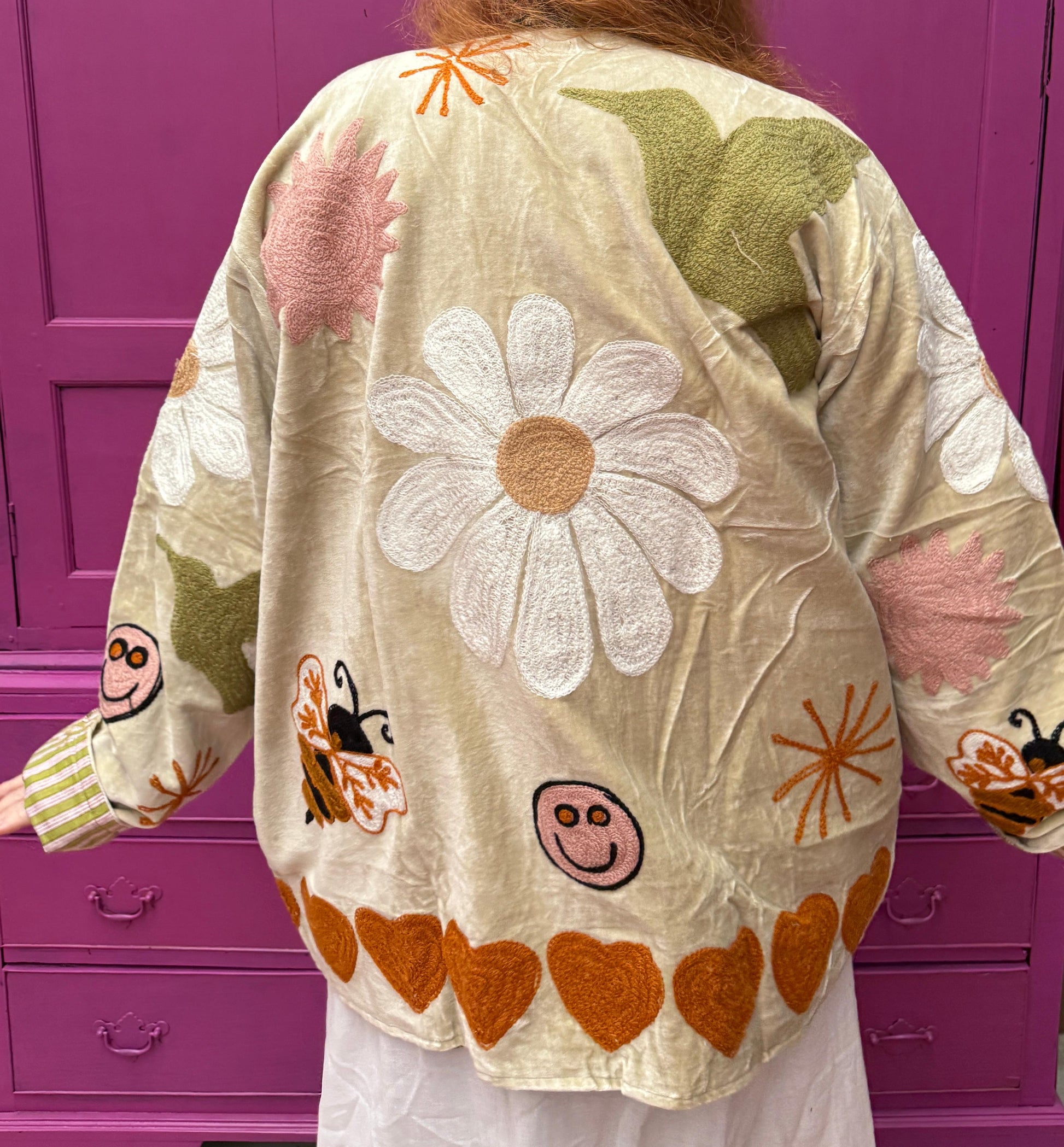 Dit jacket is gemaakt van velvet stof en geborduurd met de mooiste garen. Alles is zorgvuldig geselecteerd met respect voor mens en planeet.