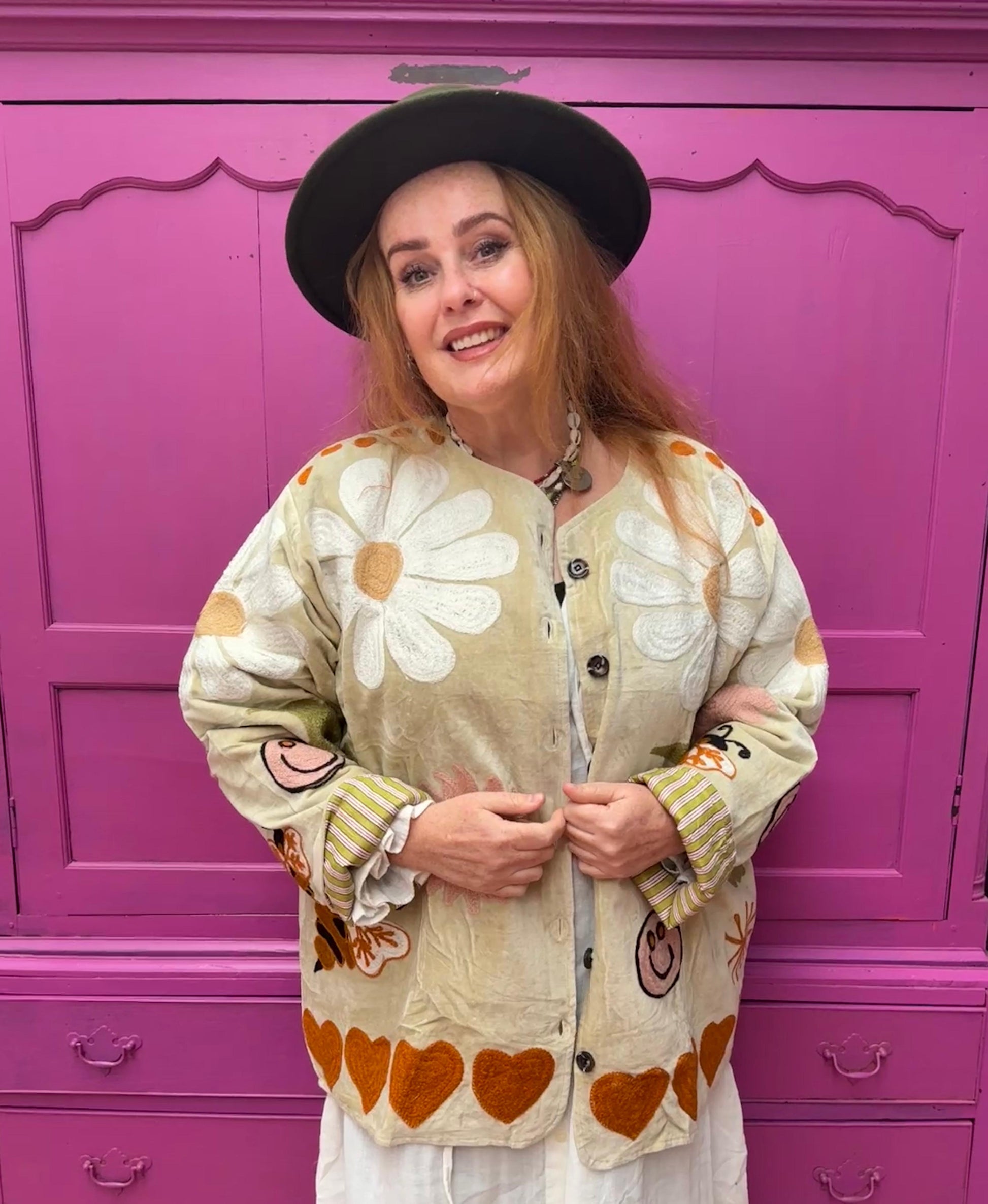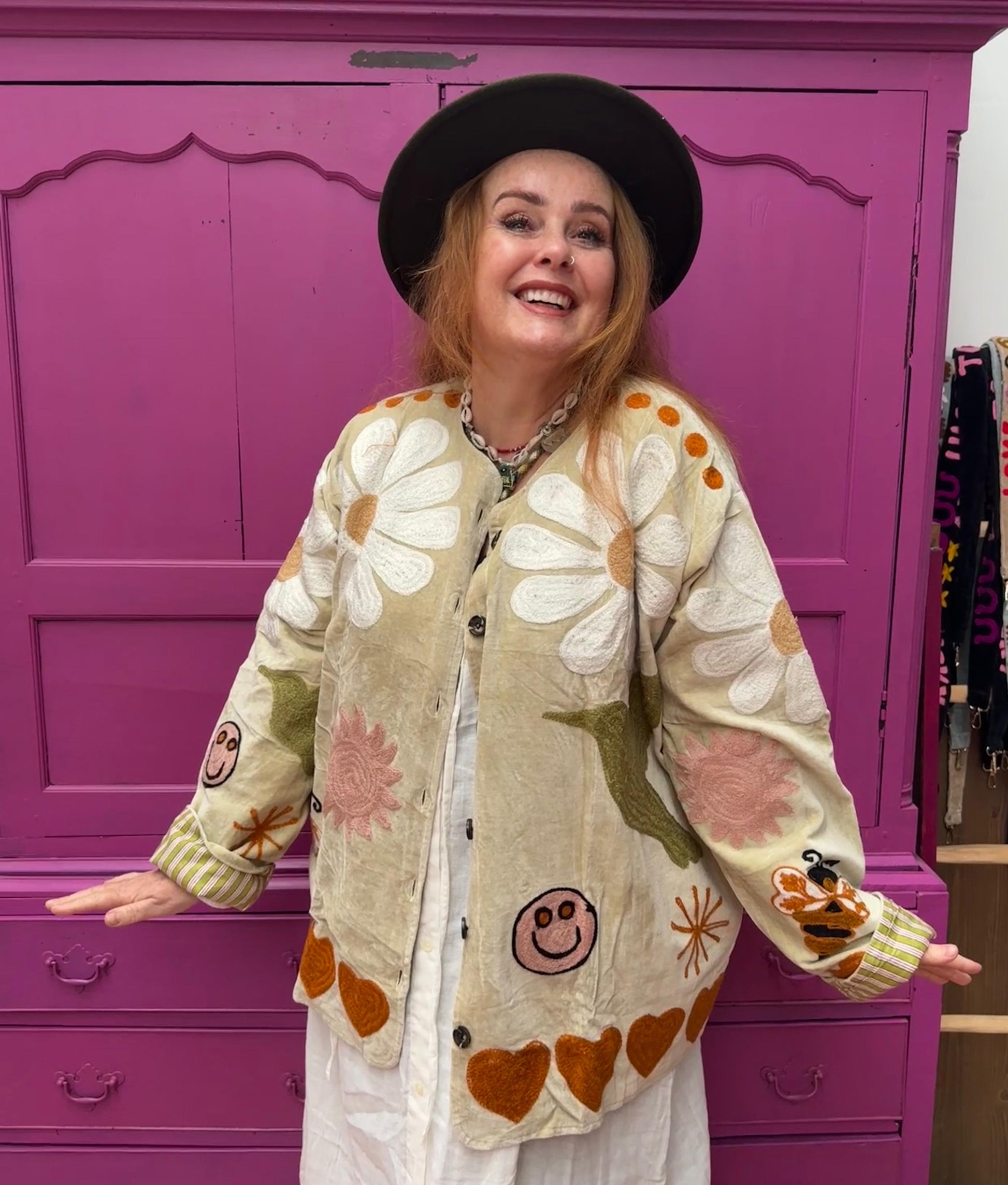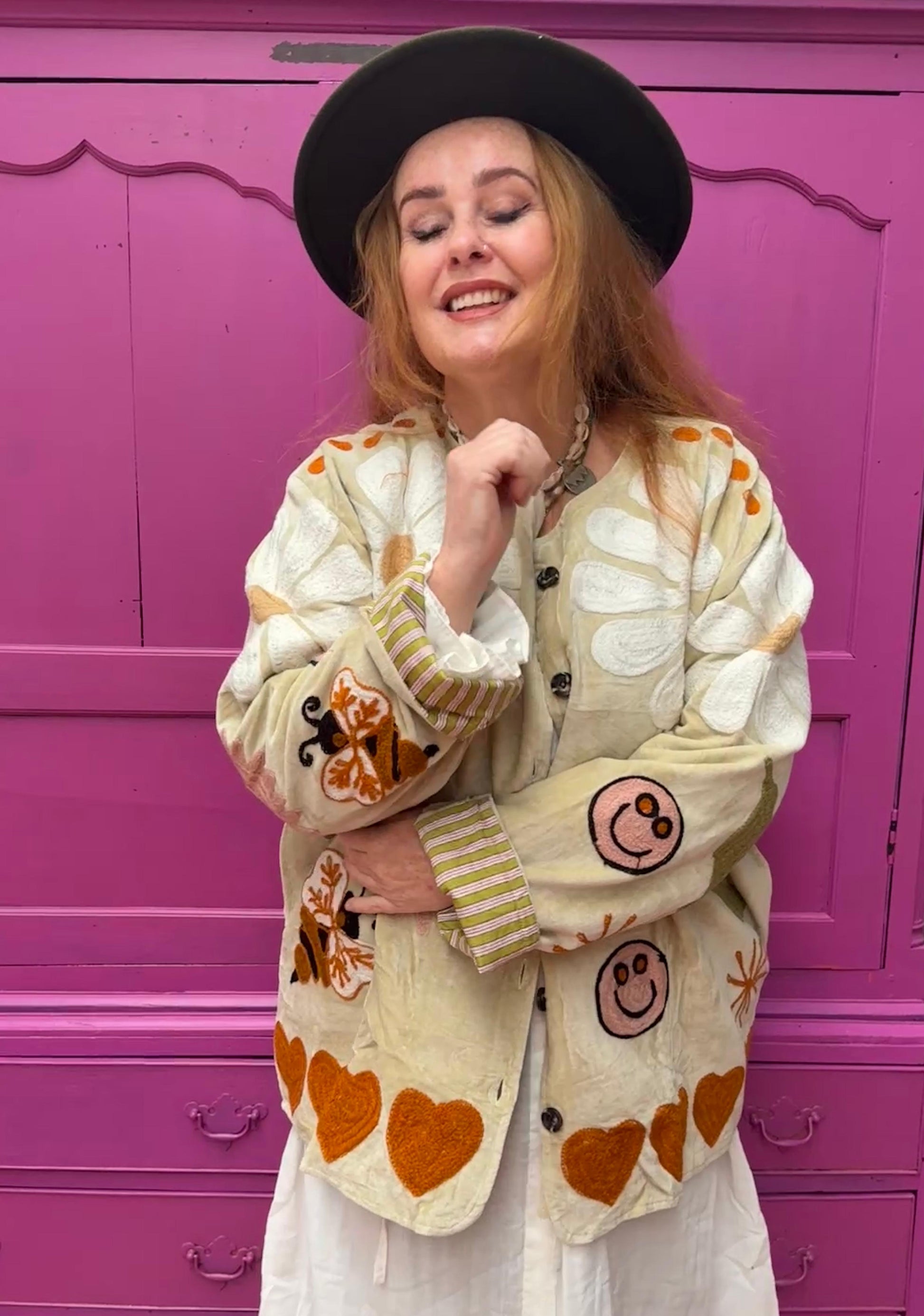 Dit jacket is gemaakt van velvet stof en geborduurd met de mooiste garen. Alles is zorgvuldig geselecteerd met respect voor mens en planeet.