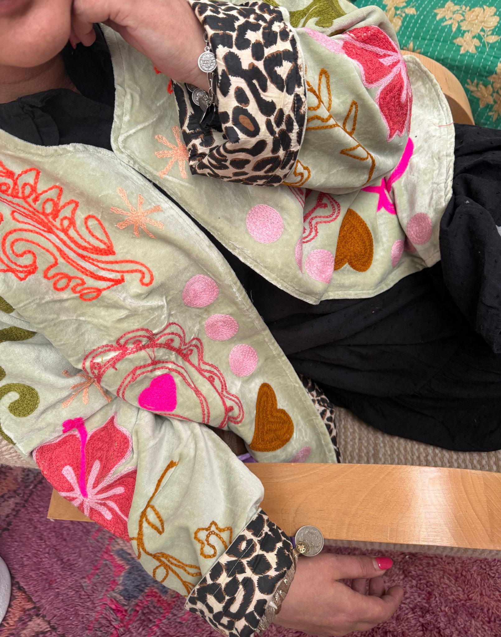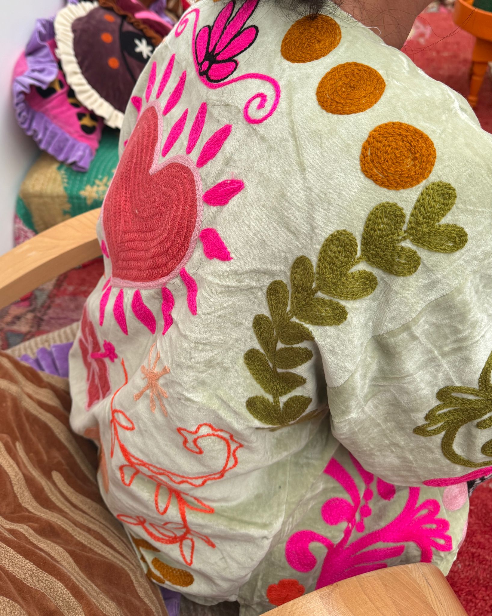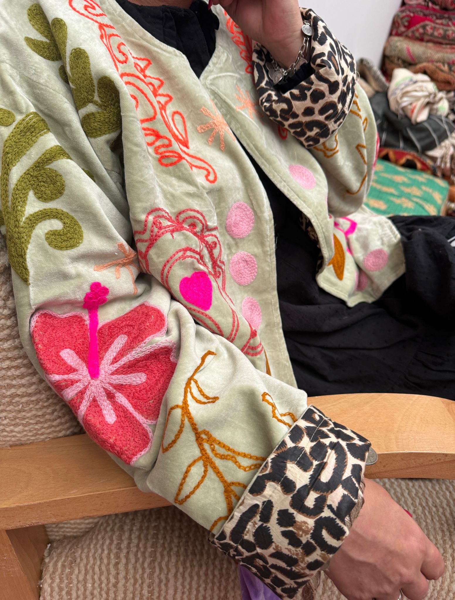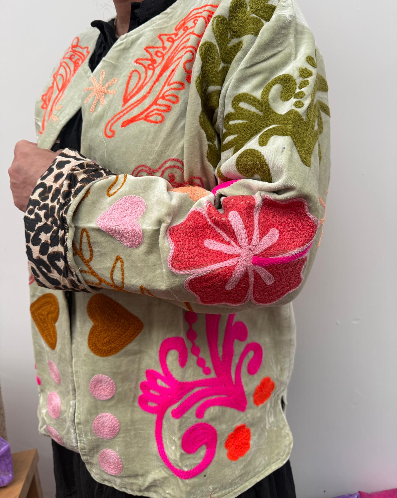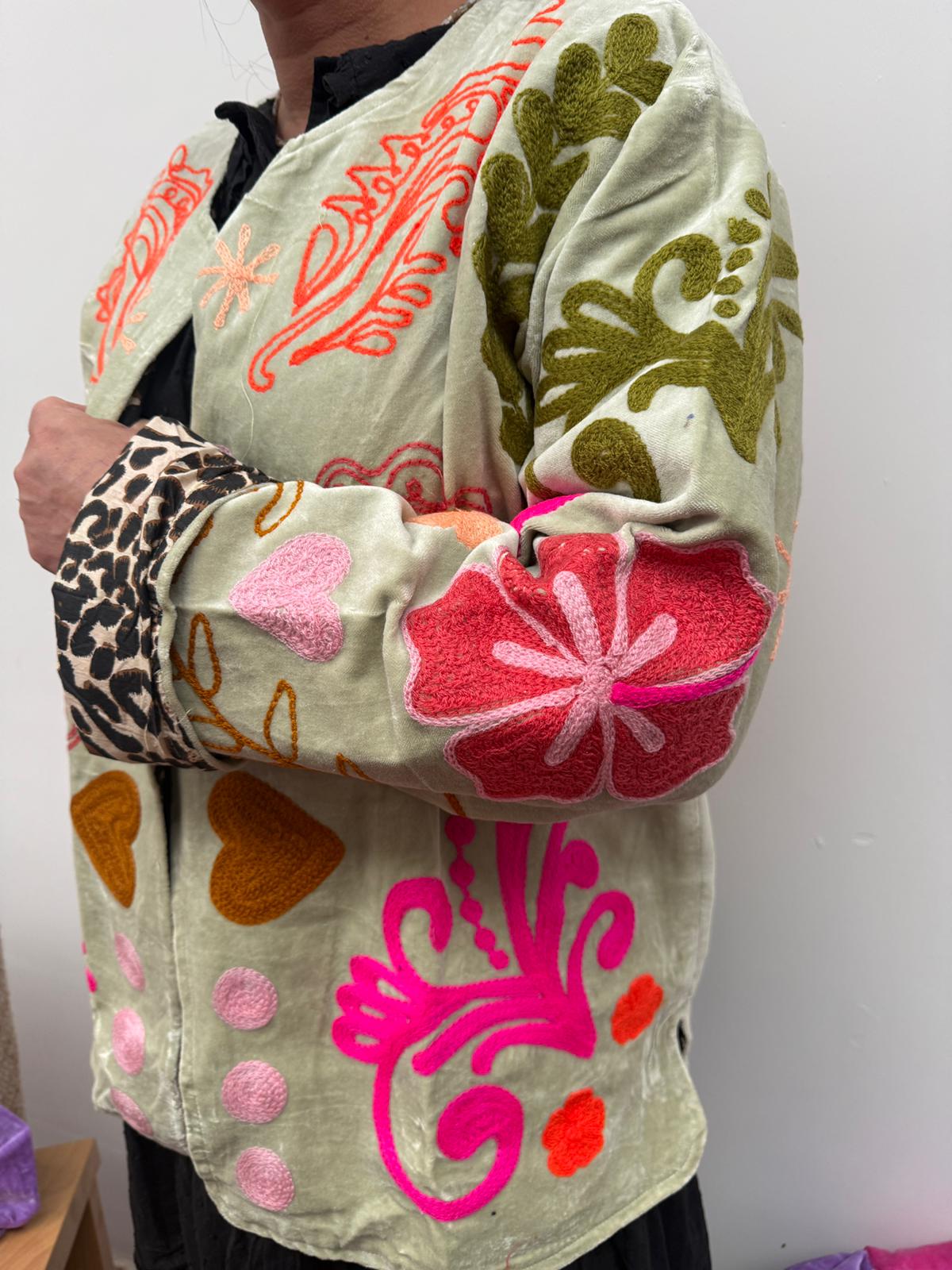 Dit jacket is gemaakt van velvet stof en geborduurd met de mooiste garen. Alles is zorgvuldig geselecteerd met respect voor mens en planeet.
