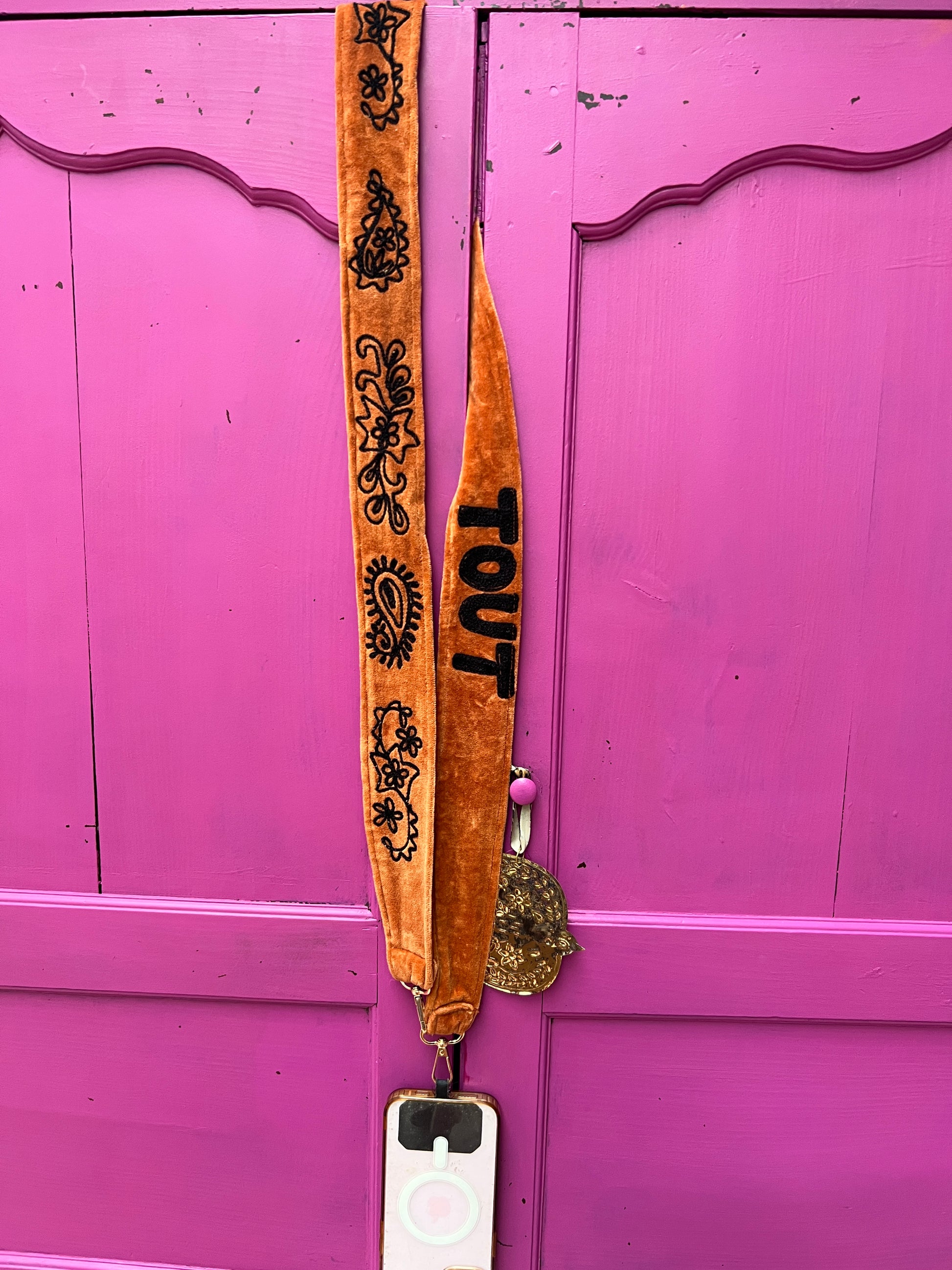 Velvet telefoon/tassenkoord is met de hand gemaakt in India, speciaal ontworpen door ToutVintage en geschikt voor wie waarde hecht aan vakmanschap, duurzaamheid en karakter. Elk stuk is uniek en komt uit een gelimiteerde oplage van slechts 100 exemplaren.